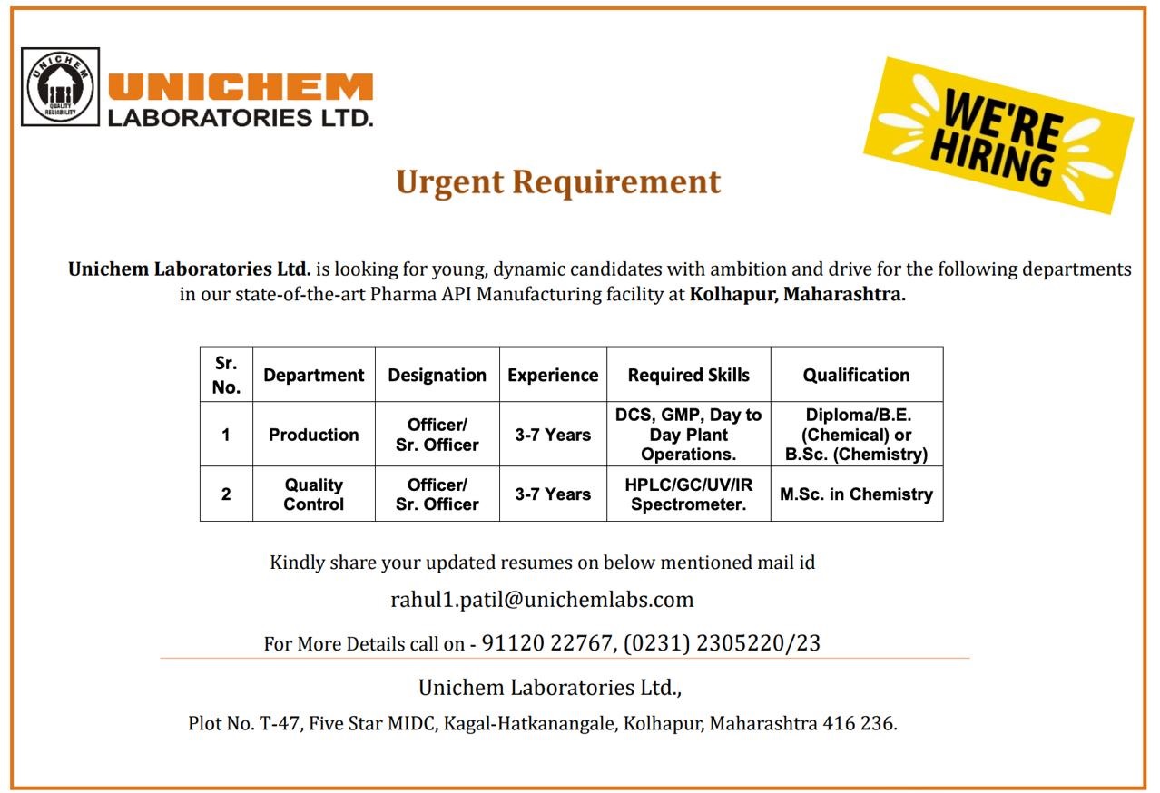 Unichem Laboratories Ltd. is seeking talented professionals to join our Pharma API Manufacturing facility in Kolhapur, Maharashtra. If you are passionate about quality and innovation, we invite you to apply for the following roles: