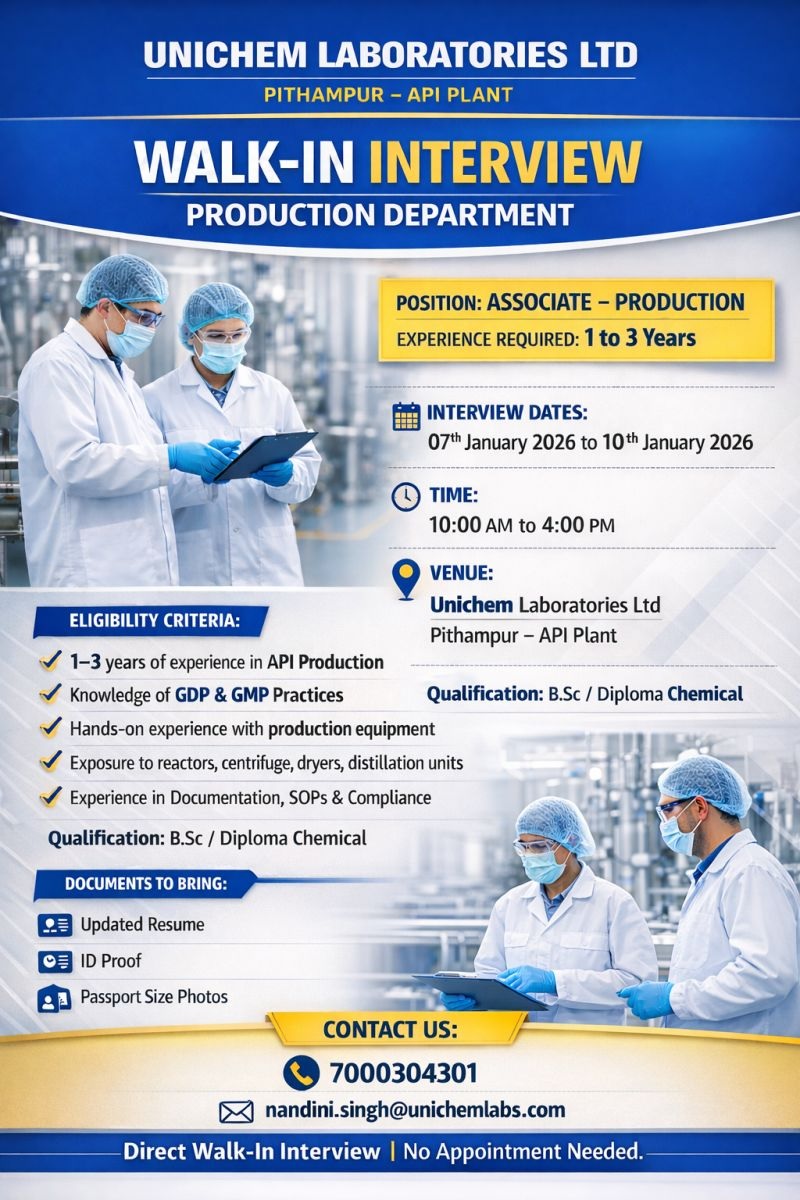 Unichem Laboratories- Walk-In Interview for API Production on January 07th to10 th 2026