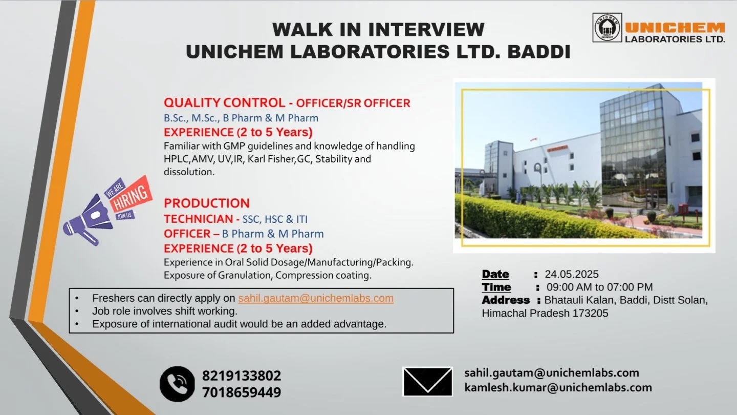 Unichem Laboratories – Walk-in interviews for Production/ QC on 24th May 2025