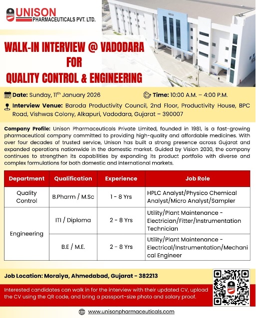 WALK-IN INTERVIEW @ VADODARA FOR QUALITY CONTROL & ENGINEERING