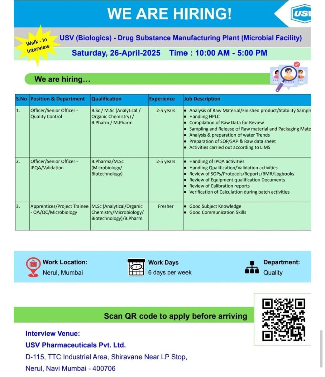 USV Pharma-Walk In Interview On 26th April 2025 USV Pharma-Walk In Interview On 26th April 2025 Post Views: 1,064 Job Category: Pharma Job Type: Full Time Job Location: Nerul Apply for this position Full Name *Email *Phone *Cover Letter *Upload CV/Resume *Allowed Type(s): .pdf, .doc, .docxBy using this form you agree with the storage and handling of your data by this website. *