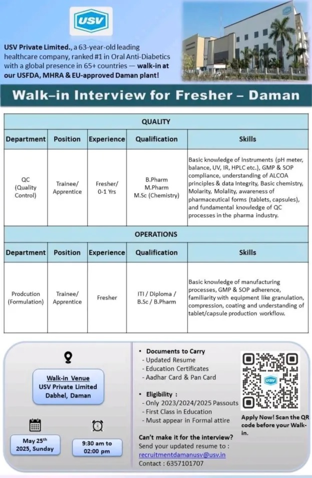 This recruitment drive targets 2023, 2024, and 2025 pass-outs with a First Class academic record. Selected candidates will gain hands-on experience in Quality Control (QC) or Production (Formulation) departments, working alongside industry experts.