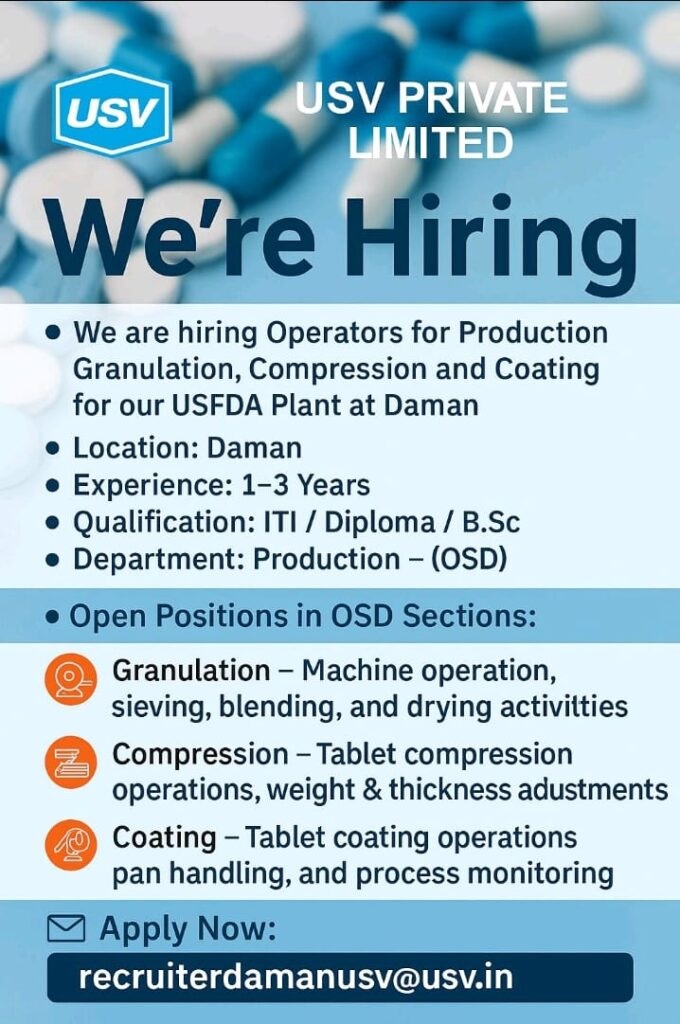 USV Private Limited-Opening For Production (OSD) 2025 USV Private Limited-Opening For Production (OSD) 2025 Post Views: 485 Job Category: Pharma Job Type: Full Time Job Location: Daman Apply for this position Full Name *Email *Phone *Cover Letter *Upload CV/Resume *Allowed Type(s): .pdf, .doc, .docxBy using this form you agree with the storage and handling of your data by this website. *