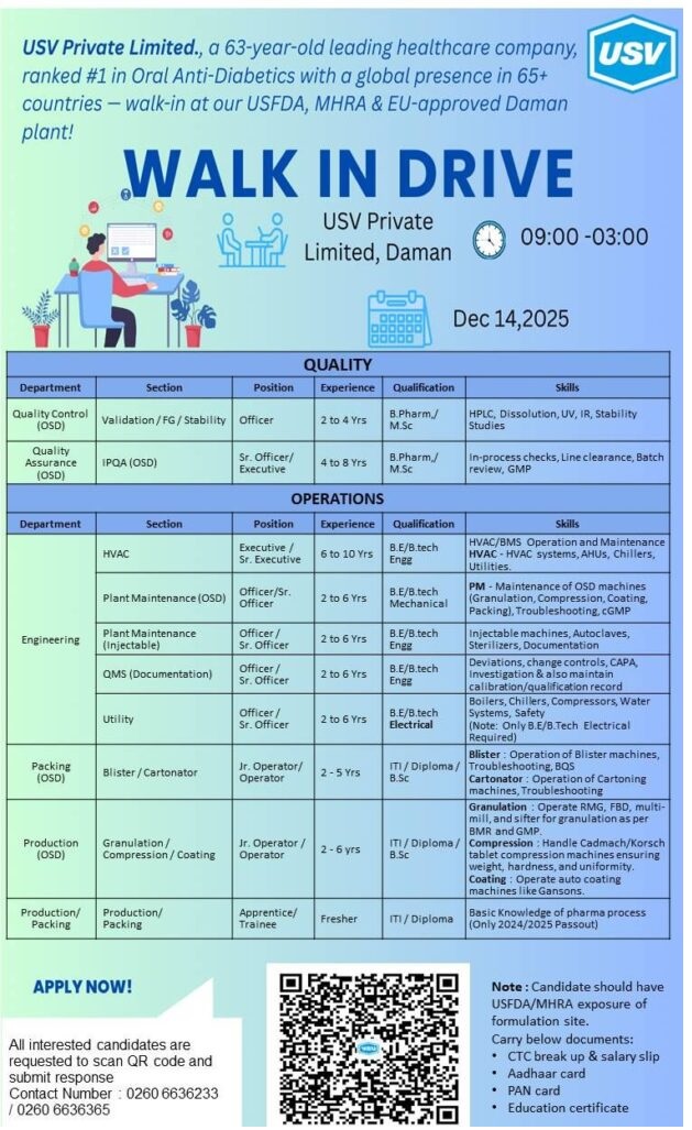 USV Private Limited, a 63-year-old leading healthcare organization ranked #1 in Oral Anti-Diabetics and operating across 65+ countries, is conducting a Walk-in Drive at its USFDA, MHRA & EU-approved Daman facility.
