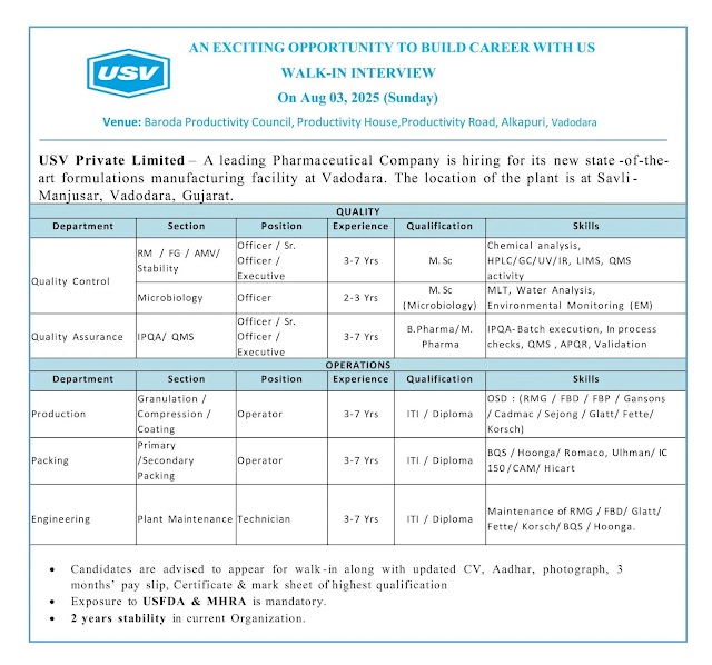 USV Private Limited – A leading Pharmaceutical Company is hiring for its new state-of-the- art formulations manufacturing facility at Vadodara. The location of the plant is at Savli- Manjusar, Vadodara, Gujarat.