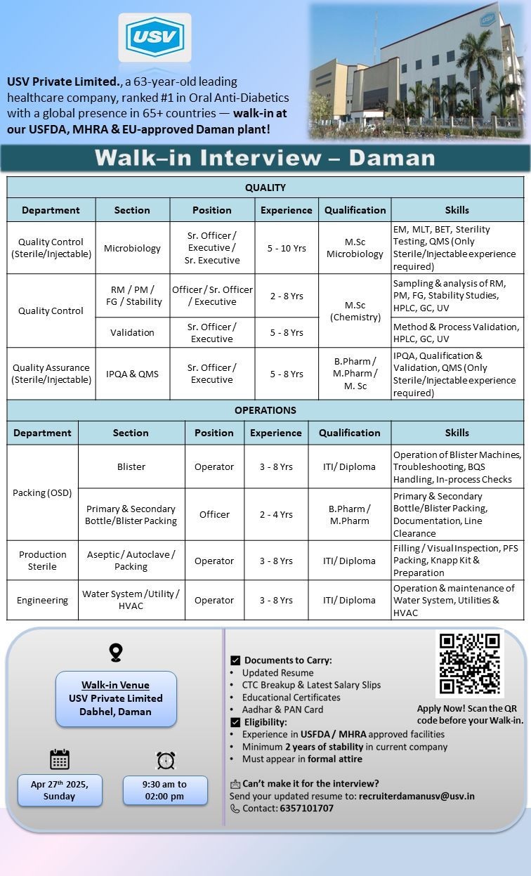 USV Private Limited., a 63-year old leading healthcare company, ranked #1 in Oral Anti-Diabetics with a global presence in 65+ countries – Walk-in at our USFDA & EU approved Daman Plant. USV- Daman Walk-In Interview Apr 27, 2025.