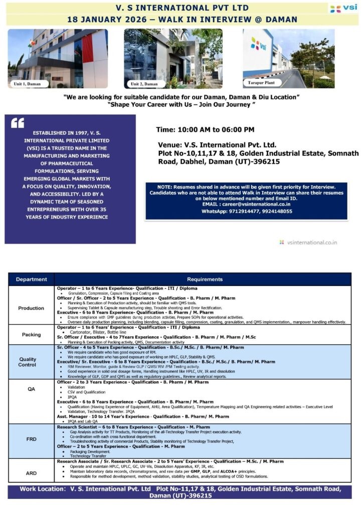 V.S. International Pvt. Ltd.-Walk-In Interview for Production, QC, QA, R&D on 18 January 2026@Daman