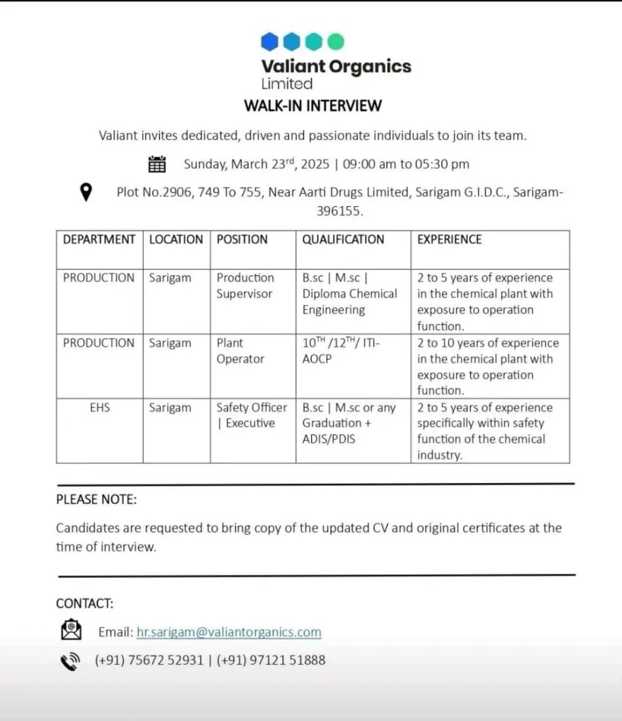 Valiant Organics-Walk in Production & EHS Professionals on 23 March 2025 Valiant Organics-Walk in Production & EHS Professionals on 23 March 2025 Post Views: 243 Job Category: Pharma Job Type: Full Time Job Location: Sarigam G.I.D.C Apply for this position Full Name *Email *Phone *Cover Letter *Upload CV/Resume *Allowed Type(s): .pdf, .doc, .docxBy using this form you agree with the storage and handling of your data by this website. *