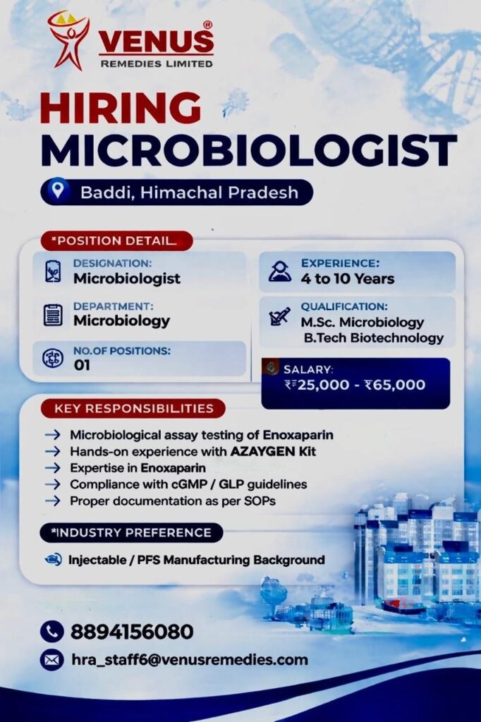 Venus Remedies- Hiring Microbiologist in Baddi Venus Remedies- Hiring Microbiologist in Baddi Post Views: 73 Job Category: Pharma Job Type: Full Time Job Location: Baddi Apply for this position Full Name *Email *Phone *Cover Letter *Upload CV/Resume *Allowed Type(s): .pdf, .doc, .docxBy using this form you agree with the storage and handling of your data by this website. *