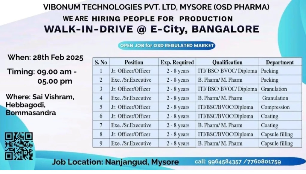VIBONUM TECHNOLOGIES PVT. LTD, MYSORE (OSD PHARMA) HIRING  FOR PRODUCTION