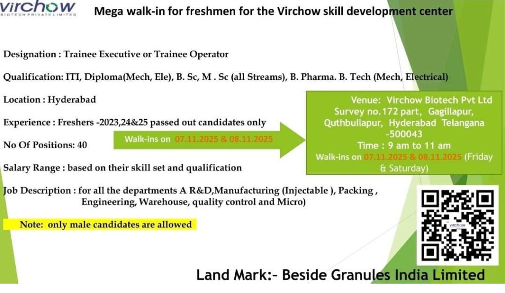 Virchow Biotech Mega Walk-In for Freshers Trainee Executive & Operator Vacancies on 7th & 8th November 2025 @Hyderabad Virchow Biotech Mega Walk-In for Freshers Trainee Executive & Operator Vacancies on 7th & 8th November 2025 @Hyderabad Date: 7th & 8th November 2025 (Friday & Saturday) Time: 9:00 AM to 11:00 AM Venue:Virchow Biotech Pvt. Ltd Survey No. 172 (Part), Gagillapur, Quthbullapur, Hyderabad – 500043 Landmark: Beside Granules India Limited Only male candidates are eligible to attend the walk-in interview. Post Views: 197 Job Category: Pharma Job Type: Full Time Job Location: Hyderabad Apply for this position Full Name *Email *Phone *Cover Letter *Upload CV/Resume *Allowed Type(s): .pdf, .doc, .docxBy using this form you agree with the storage and handling of your data by this website. *