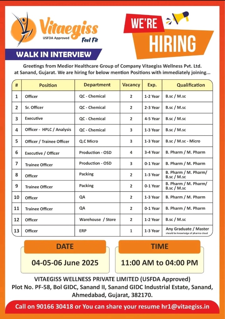 Vitaegiss Wellness -Walk In interview for QC – Chemical, Q.C Micro, Production – OSD, Packing, QA, Warehouse / Store, ERP on 04, 05, 06 June 2025 @Ahmedabad Vitaegiss Wellness -Walk In interview for QC – Chemical, Q.C Micro, Production – OSD, Packing, QA, Warehouse / Store, ERP on 04, 05, 06 June 2025 @Ahmedabad Post Views: 727 Job Category: Pharma Job Type: Full Time Job Location: Ahmedabad Apply for this position Full Name *Email *Phone *Cover Letter *Upload CV/Resume *Allowed Type(s): .pdf, .doc, .docxBy using this form you agree with the storage and handling of your data by this website. *
