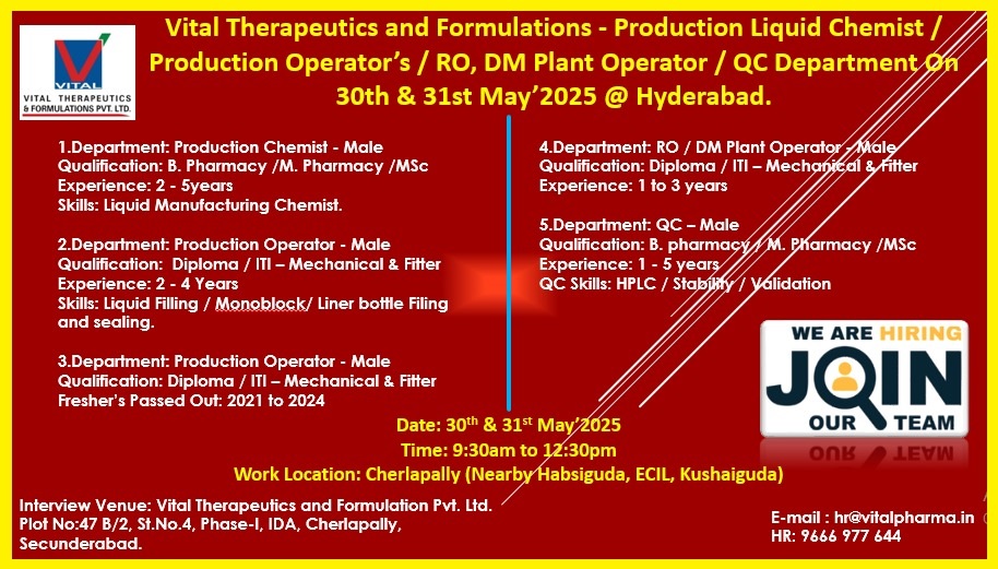 Vital Therapeutics and Formulations – Production Liquid Chemist / Production Operator’s / RO, DM Plant Operator / QC Department 30th & 31st May’2025 @ Hyderabad.