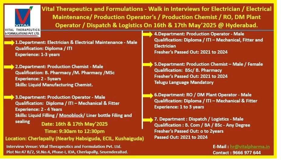 Vital Therapeutics and Formulations – Walk in Interviews for Production Chemist On 16th & 17th May’2025 @ Hyderabad.
