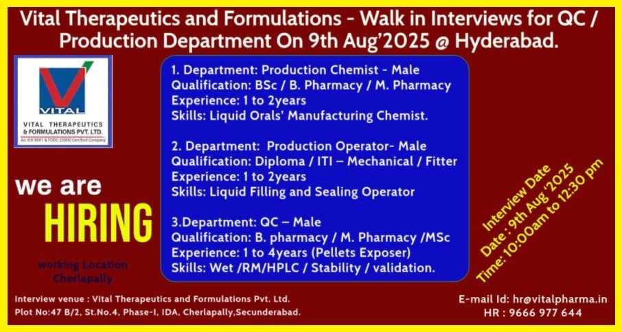 We are hiring experienced professionals in Production and Quality Control departments for our formulation unit at Cherlapally, Hyderabad.