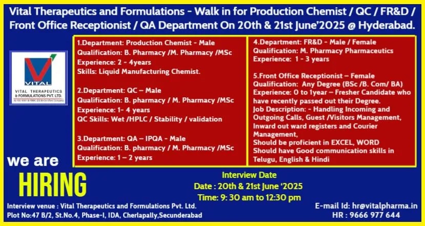 Vital Therapeutics -Walk in for Production Chemist / QC/ FR&D / freshers Front Office Receptionist / QA Department On 20th & 21st June 2025