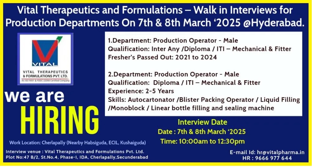 Vital Therapeutics-Walk in  for Production Departments On 7th & 8th March ‘2025 @Hyderabad.
