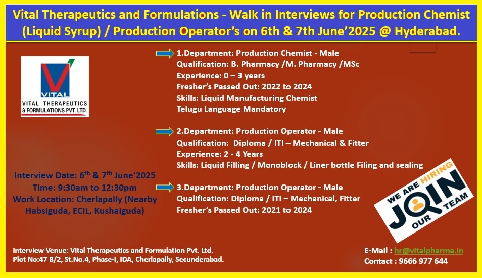 Vital Therapeutics and Formulations – Walk in Interviews for Production Chemist (Liquid Syrup) / Production Operator’s on 6th & 7th June’2025 @ Hyderabad.