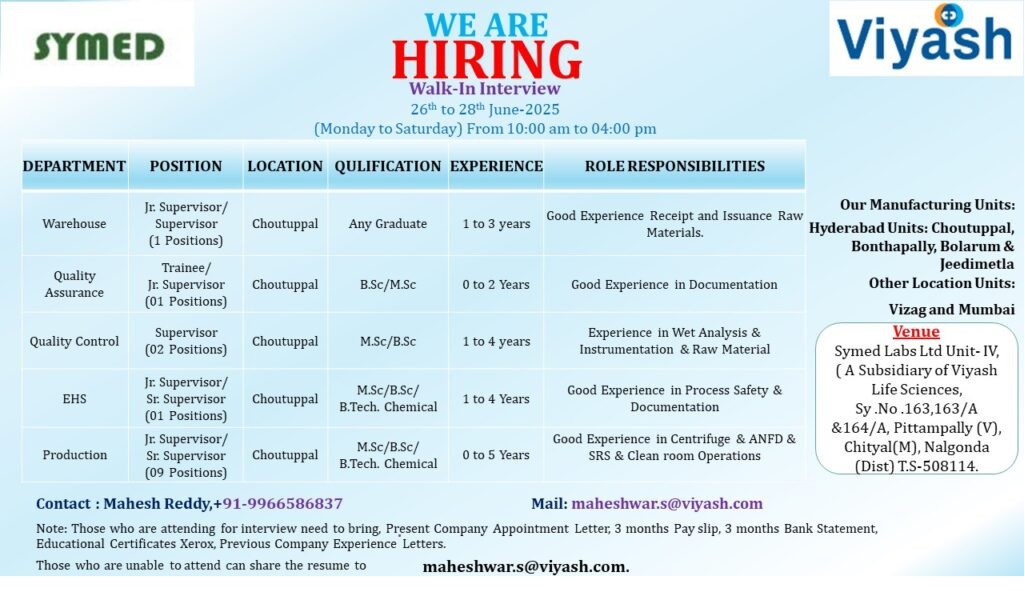 Viyash -Walk-In Interview for Warehouse, QA, QC, EHS, and Production on June 26 to 28, 2025, @Choutuppal,