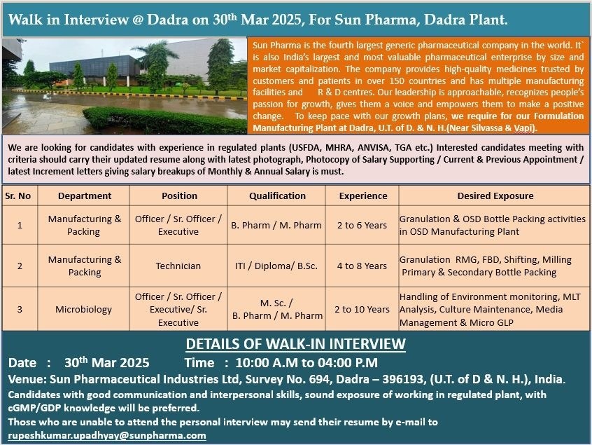 Venue: Sun Pharmaceutical Industries Ltd, Survey No. 694, Dadra – 396193, (U.T. of D & N. H.), India. Candidates with good communication and interpersonal skills, sound exposure of working in regulated plant, with CGMP/GDP knowledge will be preferred.