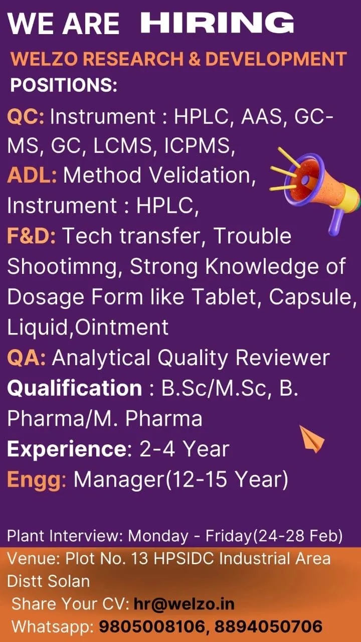 WELZO RESEARCH & DEVELOPMENT-Walk in on 24 to28 Feb 2025 WELZO RESEARCH & DEVELOPMENT-Walk in on 24 to28 Feb 2025 Post Views: 1,396 Job Category: Pharma Job Type: Full Time Job Location: solan Apply for this position Full Name *Email *Phone *Cover Letter *Upload CV/Resume *Allowed Type(s): .pdf, .doc, .docxBy using this form you agree with the storage and handling of your data by this website. *
