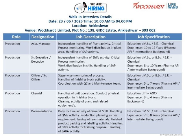 Wockhardt Limited- Walk In Interview For Chemist to Asst Manager – Production on 23rd June 2025