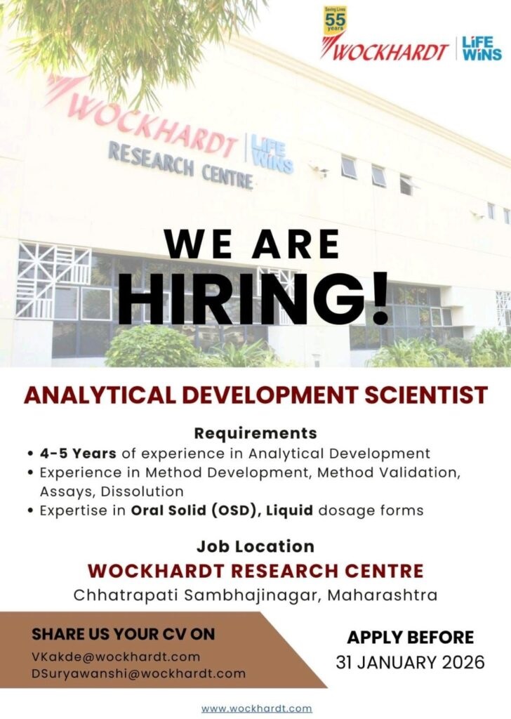 Wockhardt -Research Centre Recruitment for Analytical Development Scientists Wockhardt -Research Centre Recruitment for Analytical Development Scientists Post Views: 26 Job Category: Pharma Job Type: Full Time Job Location: Chhatrapati Sambhajinagar Apply for this position Full Name *Email *Phone *Cover Letter *Upload CV/Resume *Allowed Type(s): .pdf, .doc, .docxBy using this form you agree with the storage and handling of your data by this website. *