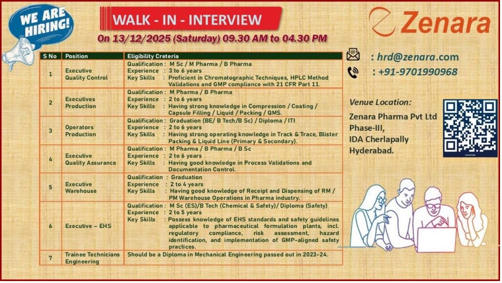 Zenara Pharma-Walk-In Interview for 13 December 2025 @ Hyderabad