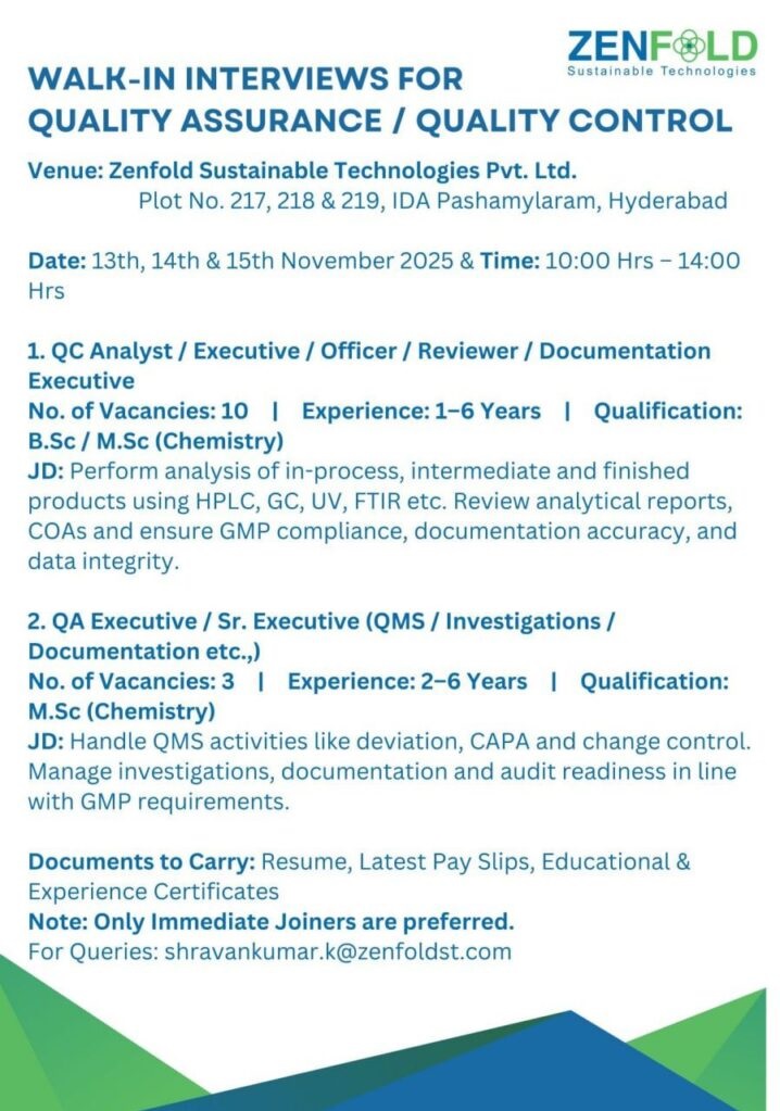Zenfold Sustainable Technologies- Walk-In Interviews for QA & QC Professionals on 13th–15th November 2025 Zenfold Sustainable Technologies- Walk-In Interviews for QA & QC Professionals on 13th–15th November 2025 Post Views: 211 Job Category: Pharma Job Type: Full Time Job Location: Hyderabad Apply for this position Full Name *Email *Phone *Cover Letter *Upload CV/Resume *Allowed Type(s): .pdf, .doc, .docxBy using this form you agree with the storage and handling of your data by this website. *