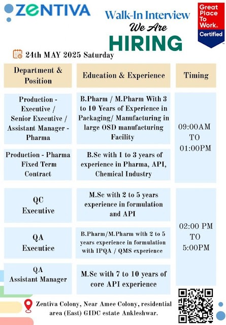 Zentiva -Walk In Interview For Production/ QC and QA on 24th May 2025