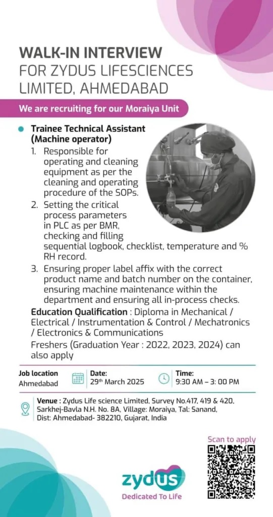 Zydus Careers- Walk-In for Trainee, Technical Assistant & Operator on 29 March 2025 Zydus Careers- Walk-In for Trainee, Technical Assistant & Operator on 29 March 2025 Post Views: 782 Job Category: Pharma Job Type: Full Time Job Location: Ahmedabad Apply for this position Full Name *Email *Phone *Cover Letter *Upload CV/Resume *Allowed Type(s): .pdf, .doc, .docxBy using this form you agree with the storage and handling of your data by this website. *