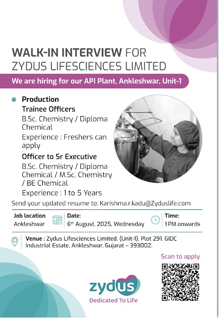 Zydus Lifesciences- Walk In Interview For Production On 6th August 2025 @ Ankleshwar