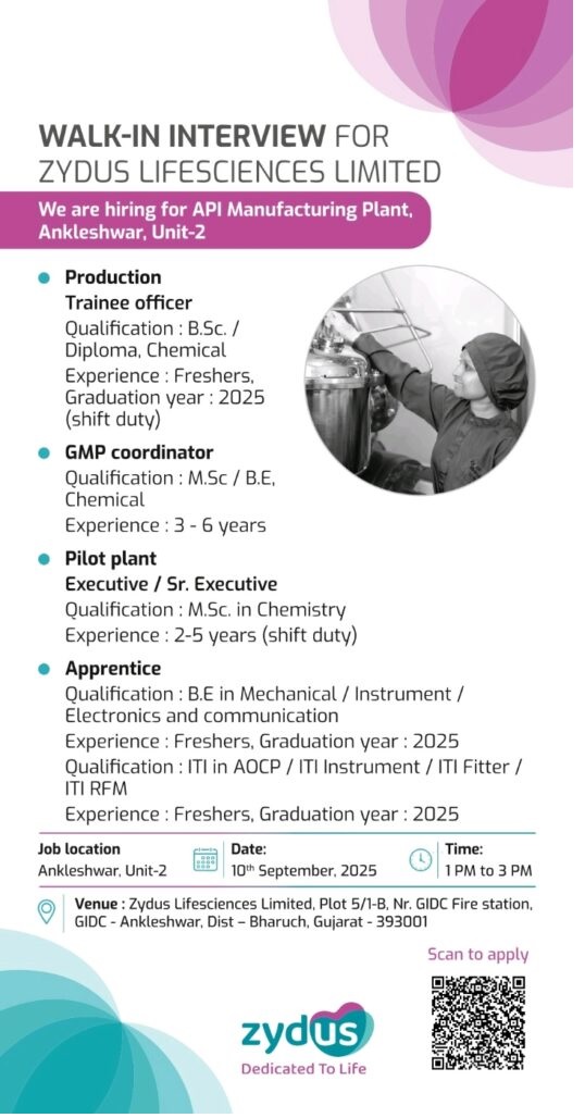 Zydus Lifesciences- Walk-In Interview on 10th September 2025 @Ankleshwar, Unit-2 Zydus Lifesciences- Walk-In Interview on 10th September 2025 @Ankleshwar, Unit-2 Post Views: 500 Job Category: Pharma Job Type: Full Time Job Location: Ankleshwar Apply for this position Full Name *Email *Phone *Cover Letter *Upload CV/Resume *Allowed Type(s): .pdf, .doc, .docxBy using this form you agree with the storage and handling of your data by this website. *