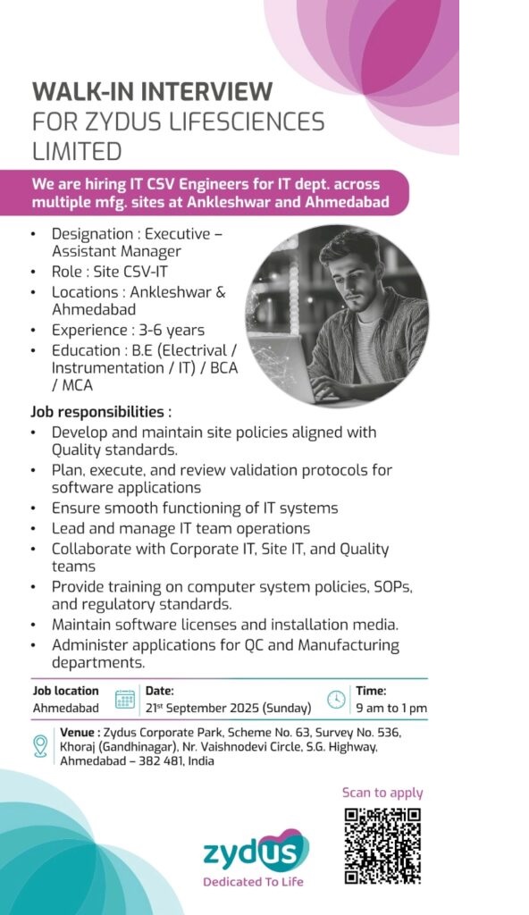 Zydus Lifesciences- Walk-in Interview for IT CSV Engineer on 21st September 2025 @ Ahmedabad & Ankleshwar Zydus Lifesciences- Walk-in Interview for IT CSV Engineer on 21st September 2025 @ Ahmedabad & Ankleshwar Post Views: 268 Job Category: Pharma Job Type: Full Time Job Location: Ahmedabad Apply for this position Full Name *Email *Phone *Cover Letter *Upload CV/Resume *Allowed Type(s): .pdf, .doc, .docxBy using this form you agree with the storage and handling of your data by this website. *