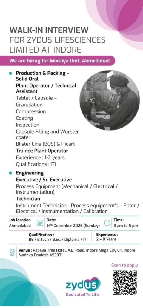 Zydus Lifesciences-Walk-In Interview for Multiple Roles on 14th December 2025@ Indore Zydus Lifesciences-Walk-In Interview for Multiple Roles on 14th December 2025@ Indore Post Views: 199 Job Category: Pharma Job Type: Full Time Job Location: Ahmadabad Apply for this position Full Name *Email *Phone *Cover Letter *Upload CV/Resume *Allowed Type(s): .pdf, .doc, .docxBy using this form you agree with the storage and handling of your data by this website. *