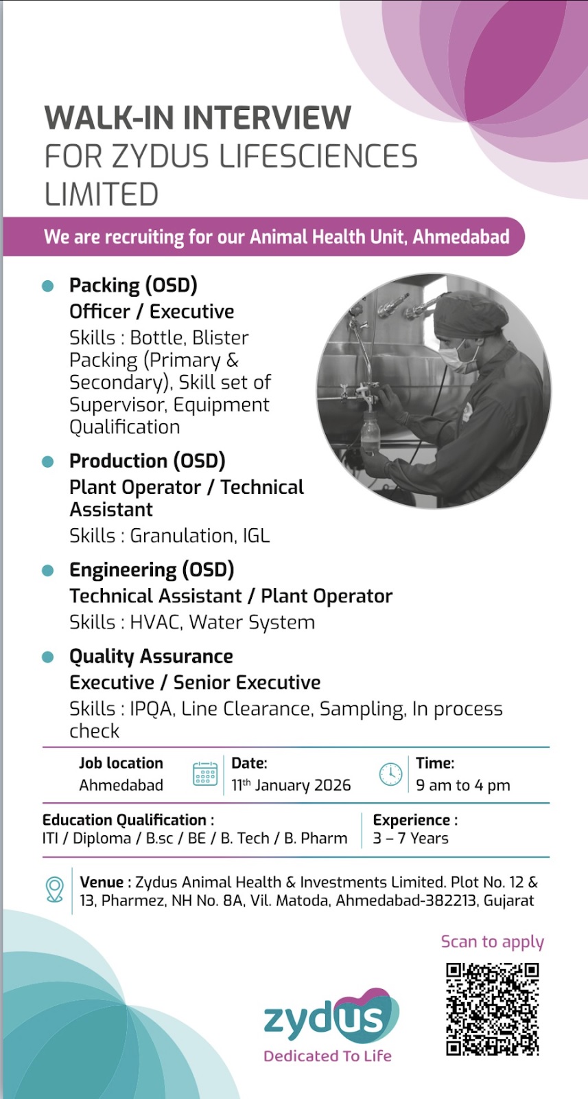 Zydus Lifesciences- Walk-In Interview for Packing, Production, Engineering, QA on 11 January 2026 @ Ahmedabad Zydus Lifesciences- Walk-In Interview for Packing, Production, Engineering, QA on 11 January 2026 @ Ahmedabad Post Views: 91 Job Category: Pharma Job Type: Full Time Job Location: Ahmadabad Apply for this position Full Name *Email *Phone *Cover Letter *Upload CV/Resume *Allowed Type(s): .pdf, .doc, .docxBy using this form you agree with the storage and handling of your data by this website. *