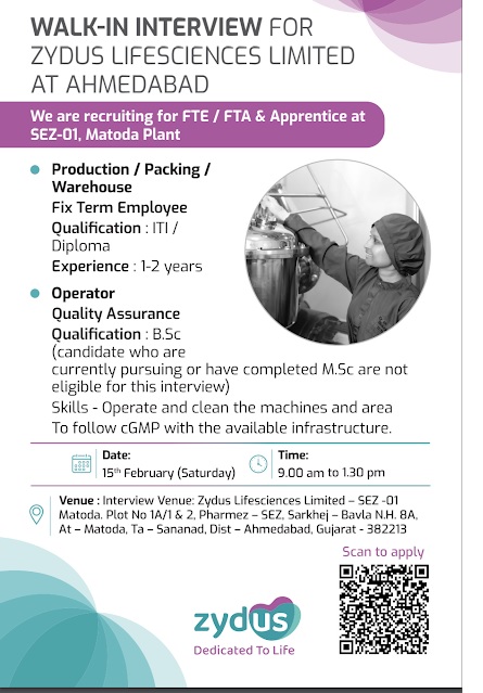 WALK-IN INTERVIEW FOR ZYDUS LIFESCIENCES LIMITED AT AHMEDABAD