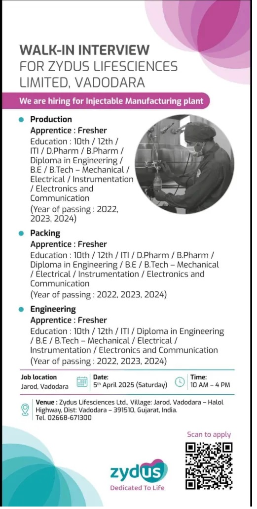 Zydus- Walk-In Drive for Freshers Production, Packing & Engineering on 5 April 2025 Zydus- Walk-In Drive for Freshers Production, Packing & Engineering on 5 April 2025 Post Views: 468 Apply for this position Full Name *Email *Phone *Cover Letter *Upload CV/Resume *Allowed Type(s): .pdf, .doc, .docxBy using this form you agree with the storage and handling of your data by this website. *
