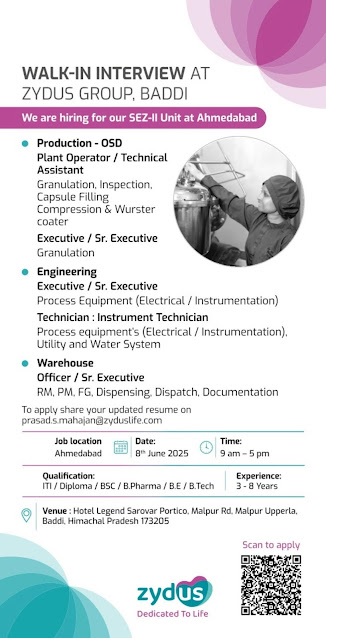 Zydus- Walk In Interview For Production/Engineering/ Maintenance & Warehouse on June 8, 2025