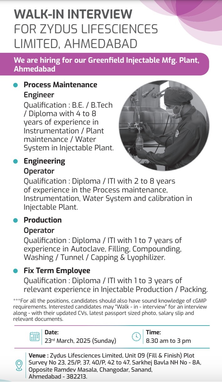 Zydus- Walk In Interview For Process Maintenance/ Engineering/ Production on 23rd March, 2025 Zydus- Walk In Interview For Process Maintenance/ Engineering/ Production on 23rd March, 2025 Post Views: 563 Apply for this position Full Name *Email *Phone *Cover Letter *Upload CV/Resume *Allowed Type(s): .pdf, .doc, .docxBy using this form you agree with the storage and handling of your data by this website. *